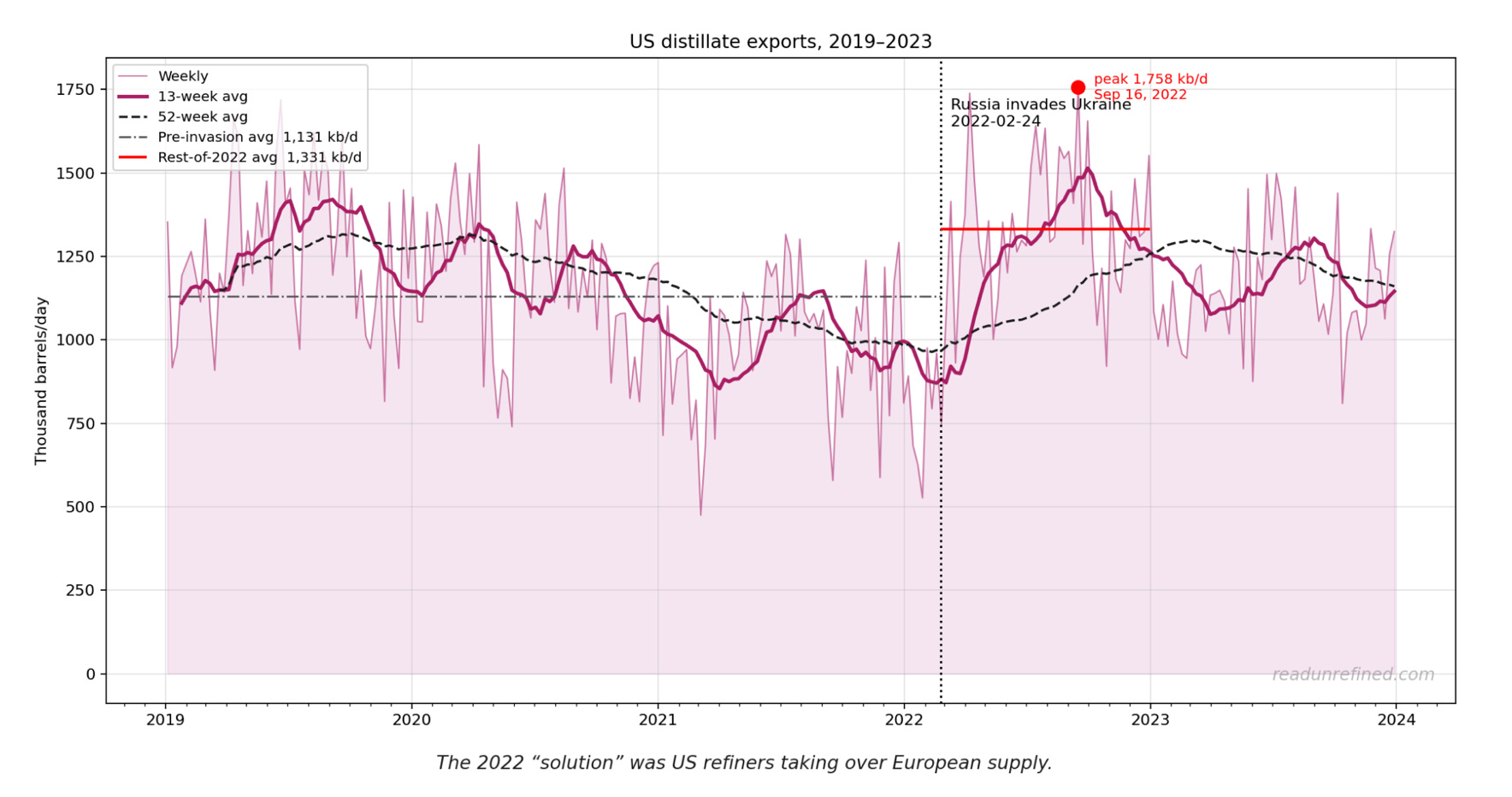 Meanwhile, the US Gulf Coast took over as Europe’s primary diesel supplier, and exports rose from their normal 1 MMbbl/day range to a sustained 1.3 to 1.5 MMbbl/day by late 2022.
