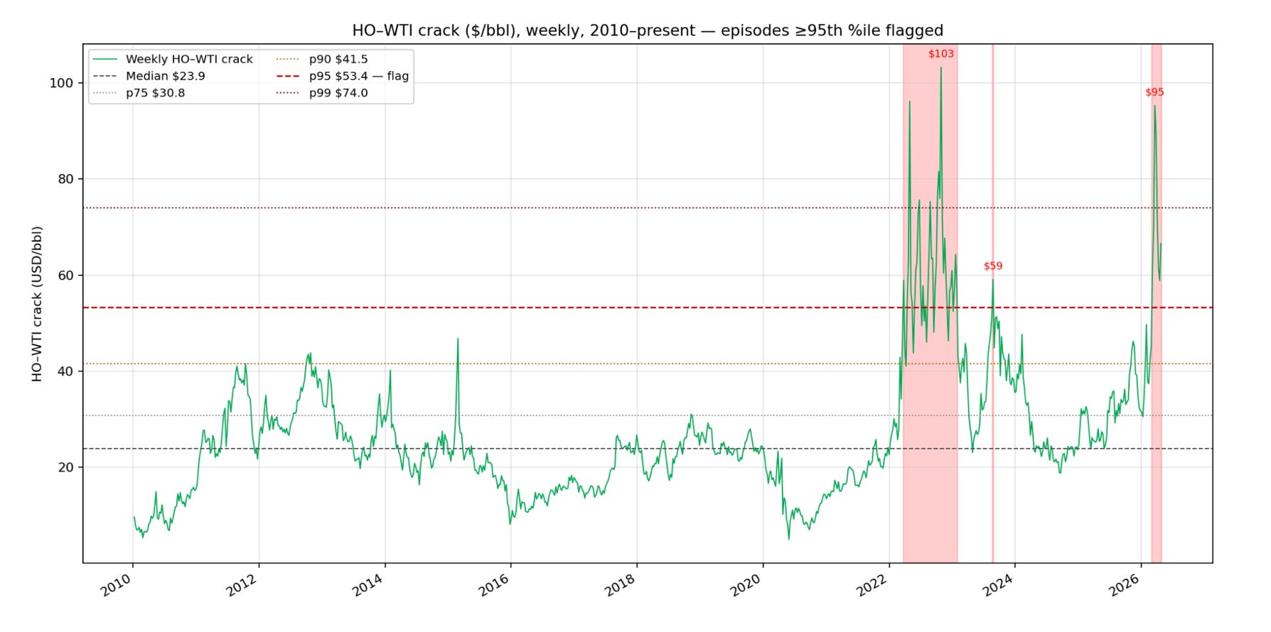 The HO-WTI crack spread is at $67. That’s the 99th percentile of the last 15 years. Only twice since 2010 have we been at these levels: the 2022 Ukraine response and a brief 2023 spike.
