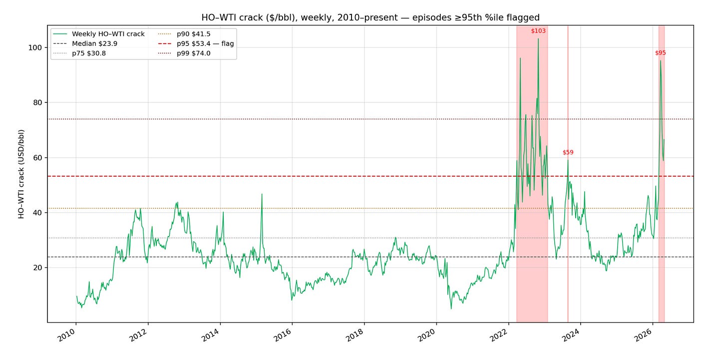 I collect an obscene amount of data on these markets. I went back and looked at what the data says during times of large HO-WTI crack spreads. Going back to 2010, the P95 threshold is $53.36, and only three episodes total have hit this level.