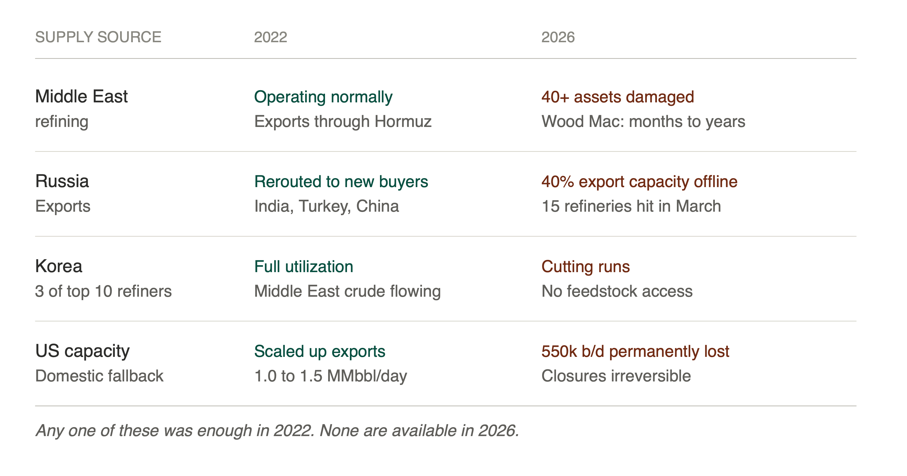 Hormuz is effectively closed. Russia is embargoed and its refineries are being systematically degraded by Ukrainian strikes. Even if Hormuz opened this afternoon, tankers need 20-40 days to reach Europe and Asia. Middle East refining capacity damaged in the war needs months to years to restart, per Wood Mackenzie. The rearrangement mechanism that worked in 2022, where Russian barrels found non-EU buyers and US barrels filled Europe, doesn’t work when the physical infrastructure is broken instead of rerouted.